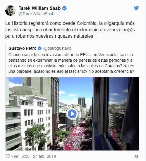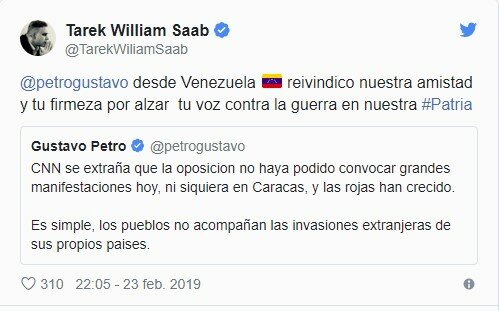 Tal es la ambición y política sin principios de Navarro y López que no dudan en pactar con Petro, máximo exponente y defensor en Colombia de la dictadura de Maduro, correspondido y replicado, con agradecimiento y saludos de amistad, por parte del fiscal de Maduro, Tareck William Saab en twitter: