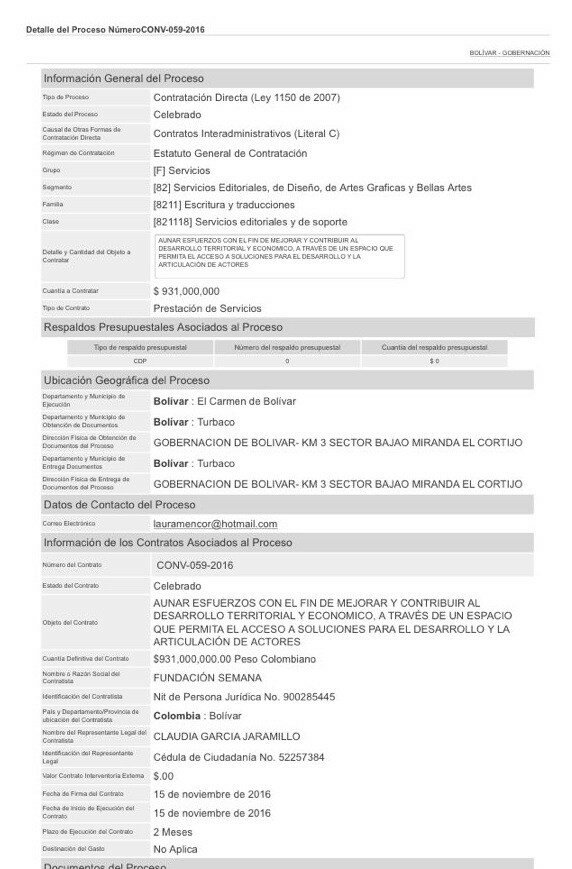 - El contrato 059 de 2016 por 931 millones de pesos (300 mil dólares) para la Fundación Semana en cabeza de Claudia García Jaramillo, esposa de Daniel Samper Ospina, sobrino del presidente financiado por el Cartel de Cali, Ernesto Samper.