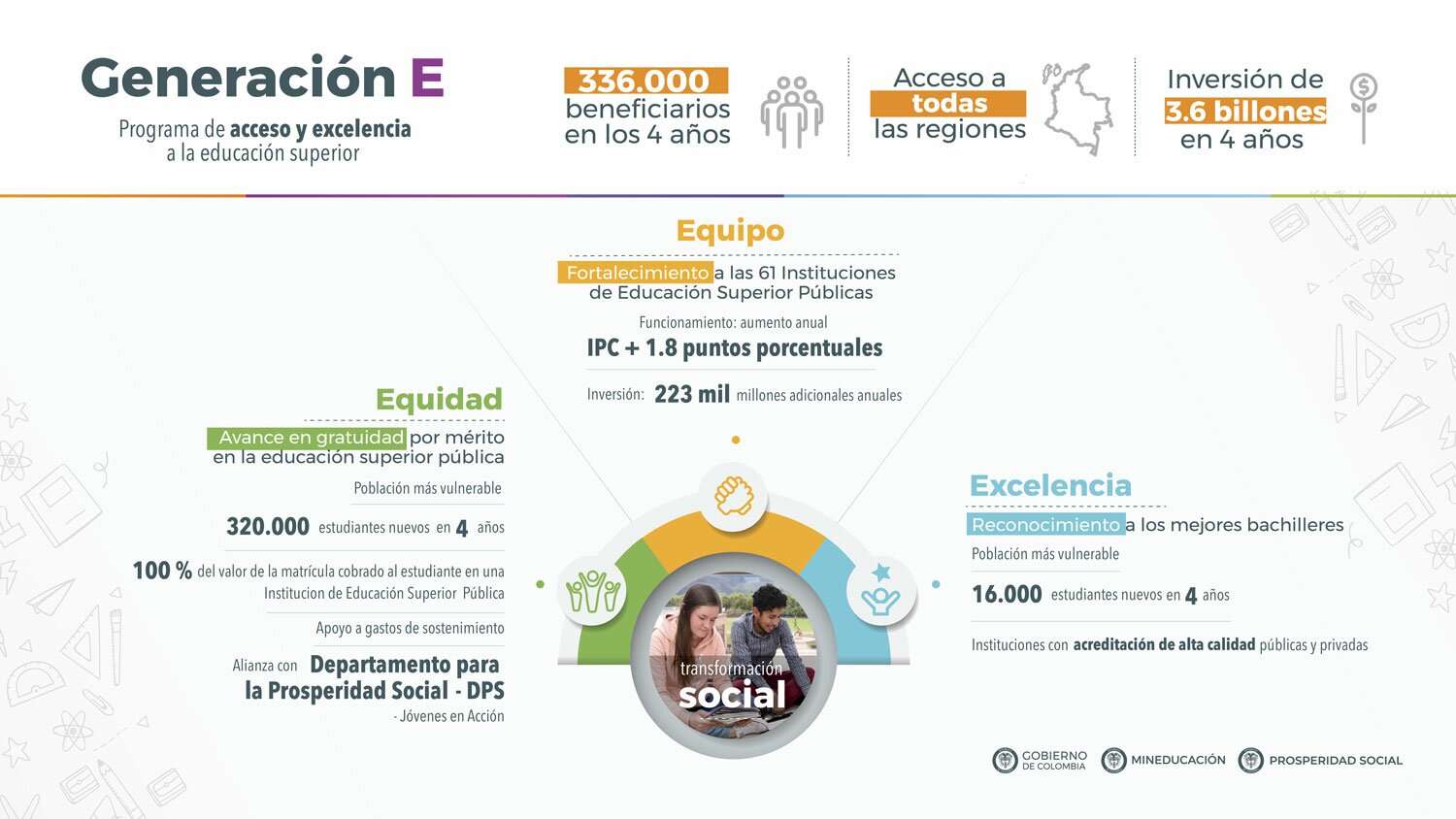 Hay algo contundente del programa Generación E y es que, de hecho, aún no ha planteado ningún puntaje máximo en las pruebas Saber 11 como exigencia, es decir que en ese sentido será muchísimo más incluyente. Los únicos requisitos que tendrá que cumplir el beneficiado serían 2: